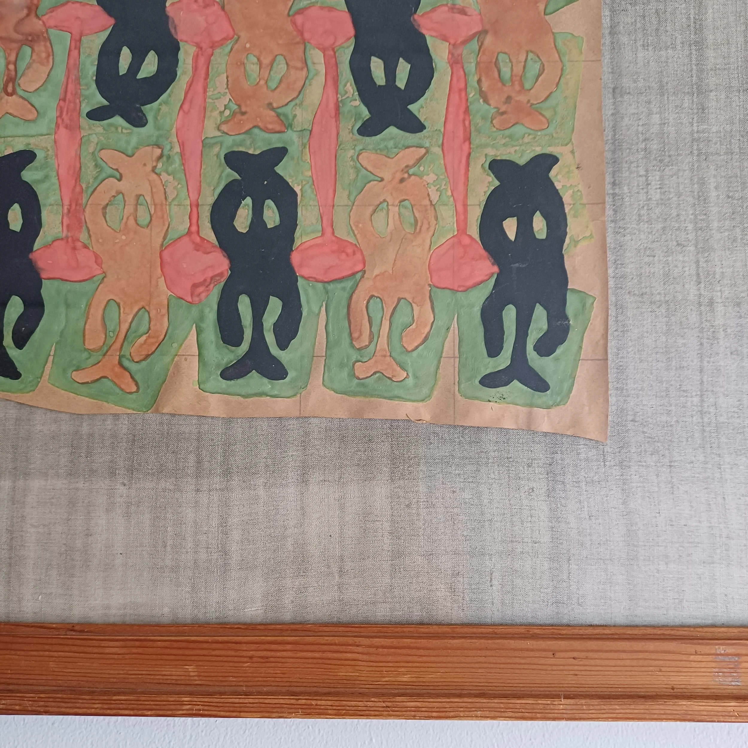 A watercolour which was owned by Molly and Jack Pritchard, who were the founders of the Isokon Firm and Isokon Furniture Company. They commissioned the building of the iconic Isokon Flats on Lawn Road Hampstead designed by the architect Wells Coates. They lived in the flats, so this artwork may have hung there as well as in their Isokon bungalow in Suffolk. The painting depicts abstract repeating patterns on paper which is mounted on fabric. The frame is pine and it does show signs of age with gaps at the corners.